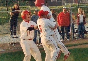 Eli being picked up after knocking in the winning run against their rival.